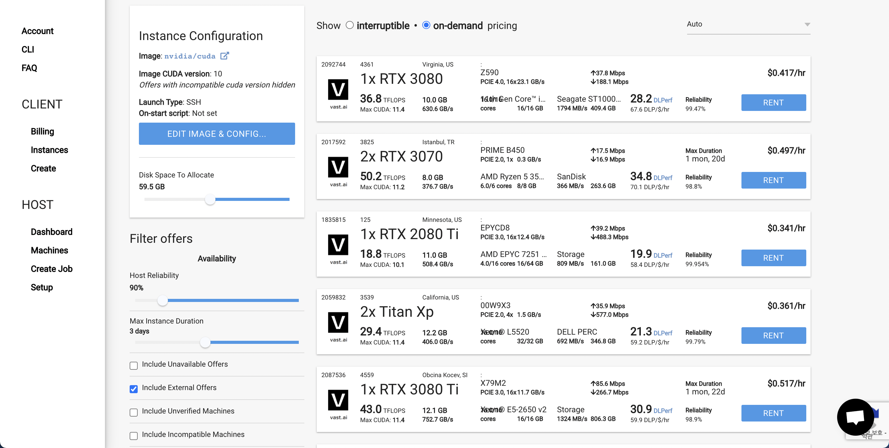 나는 3080ti로 연구를 하고 있는데, 메모리가 부족하고 실험을 몇 개 더 돌리고 싶어 3090나 V100 대여를 알아보고 있었다. 그런데 GPU 대여 업체 중에서 일 단위나 시간 단위로 대여를 해주고, 즉시 빌릴 수 있는 곳이 거의 없었다. 또는 가격이 시간 당 4000원 (T4)나 일 20000원 (3090) 으로 비쌌다. 그러다가 찾은 것이 vast.ai이다.